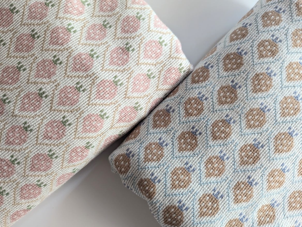 いちごが規則的に並ぶデザインで、子ども服や小物づくりにぴったりの控えめな甘さが魅力。