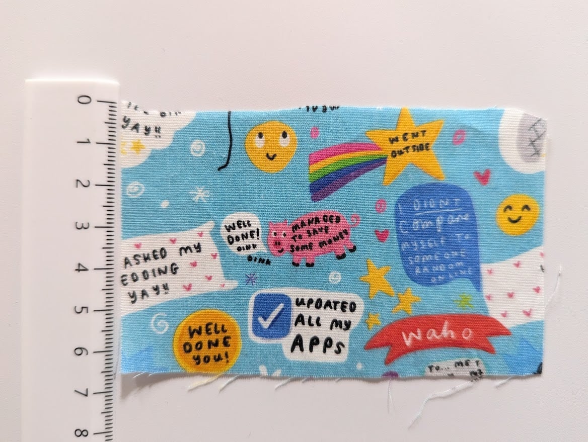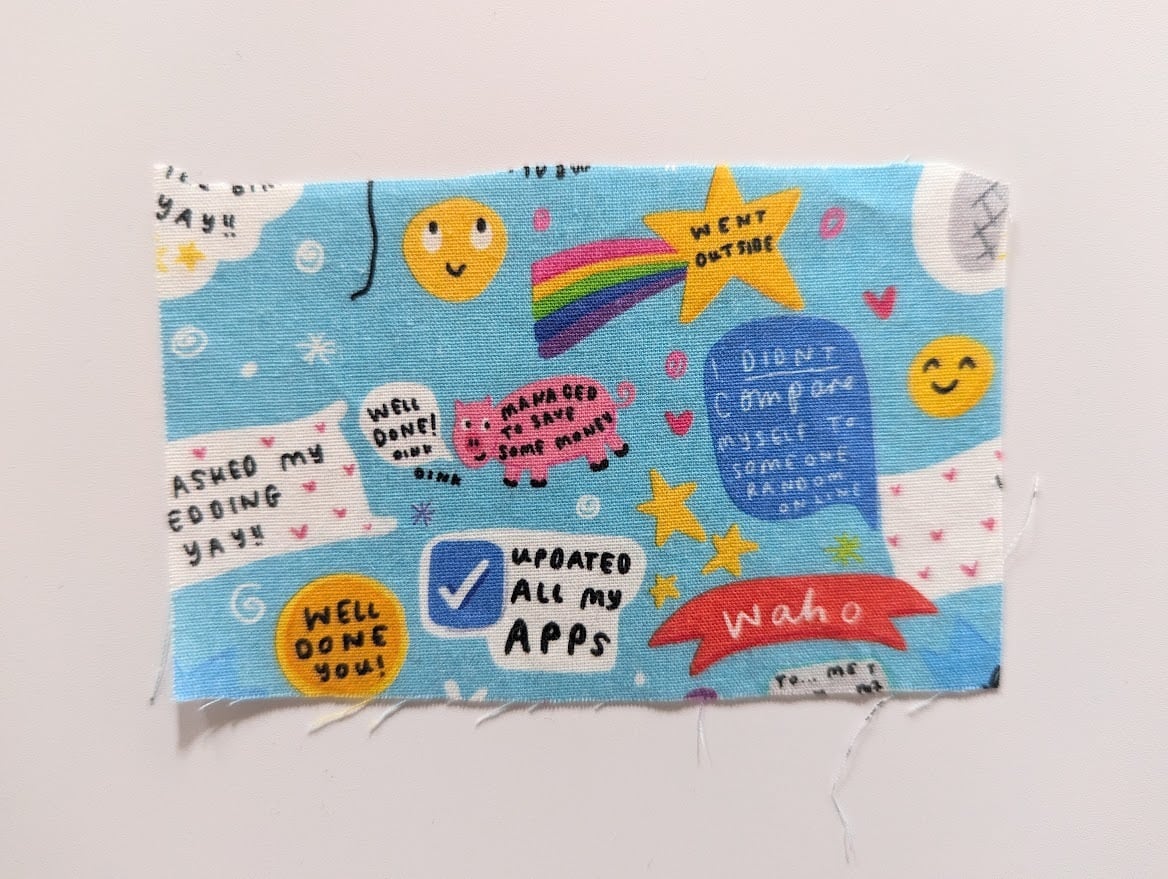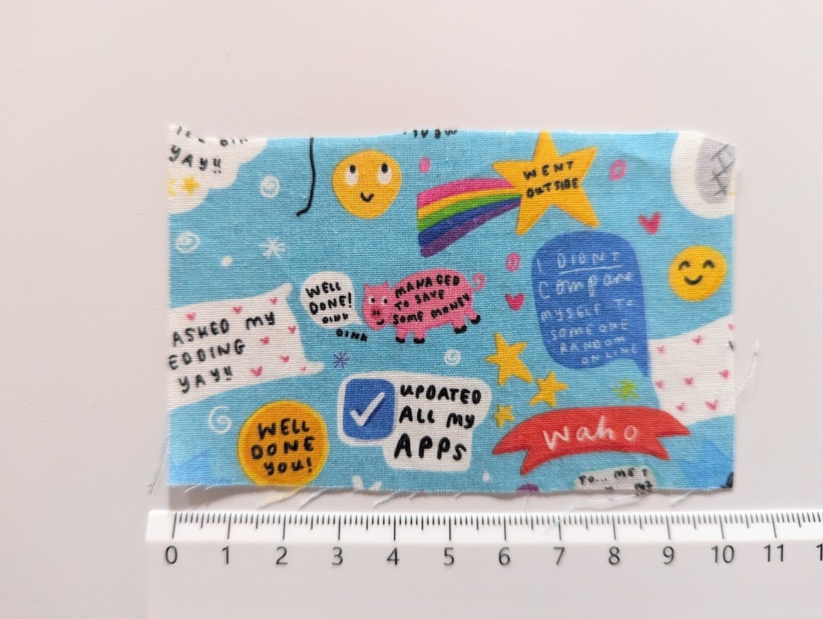 ブルーにカラフルポップなスマイルが可愛い生地。