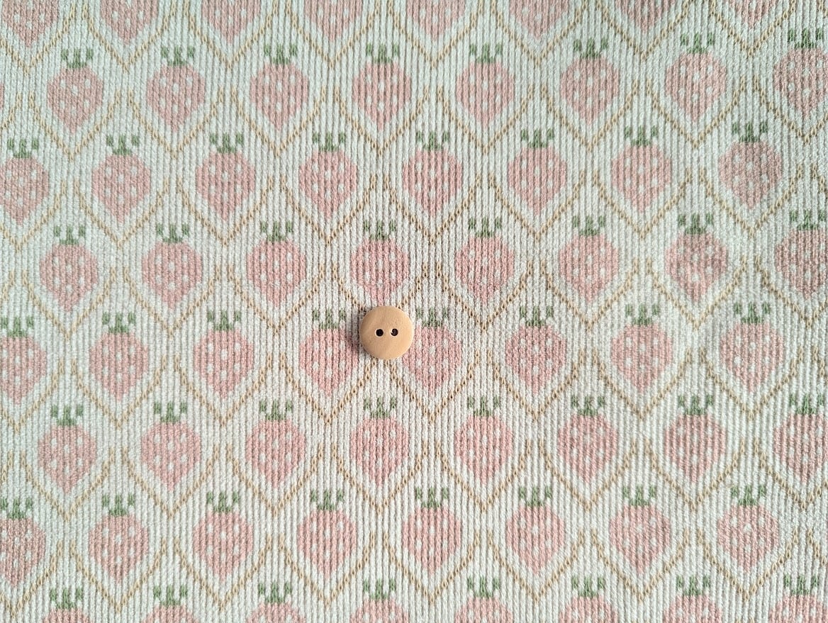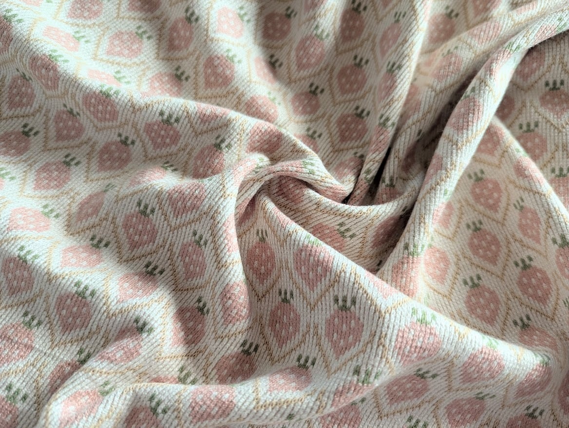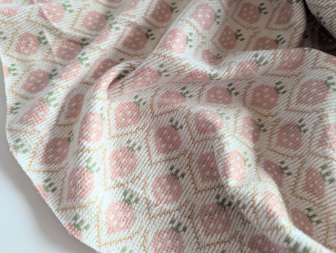 いちごが規則的に並ぶデザインで、子ども服や小物づくりにぴったりの控えめな甘さが魅力。