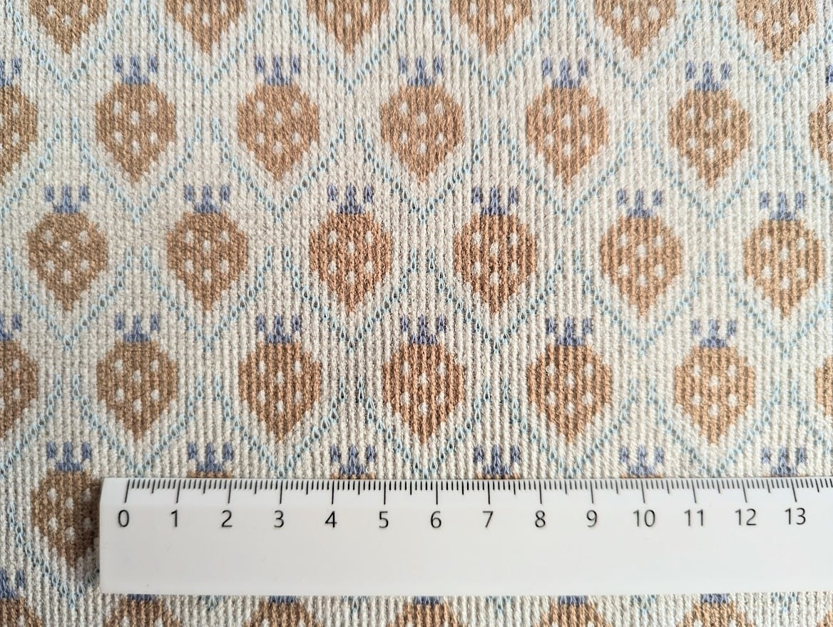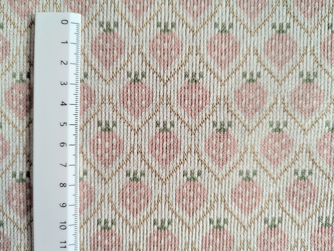 やさしいミルキートーンで編み上げた、ふんわり可愛いいちご柄のニット生地です。