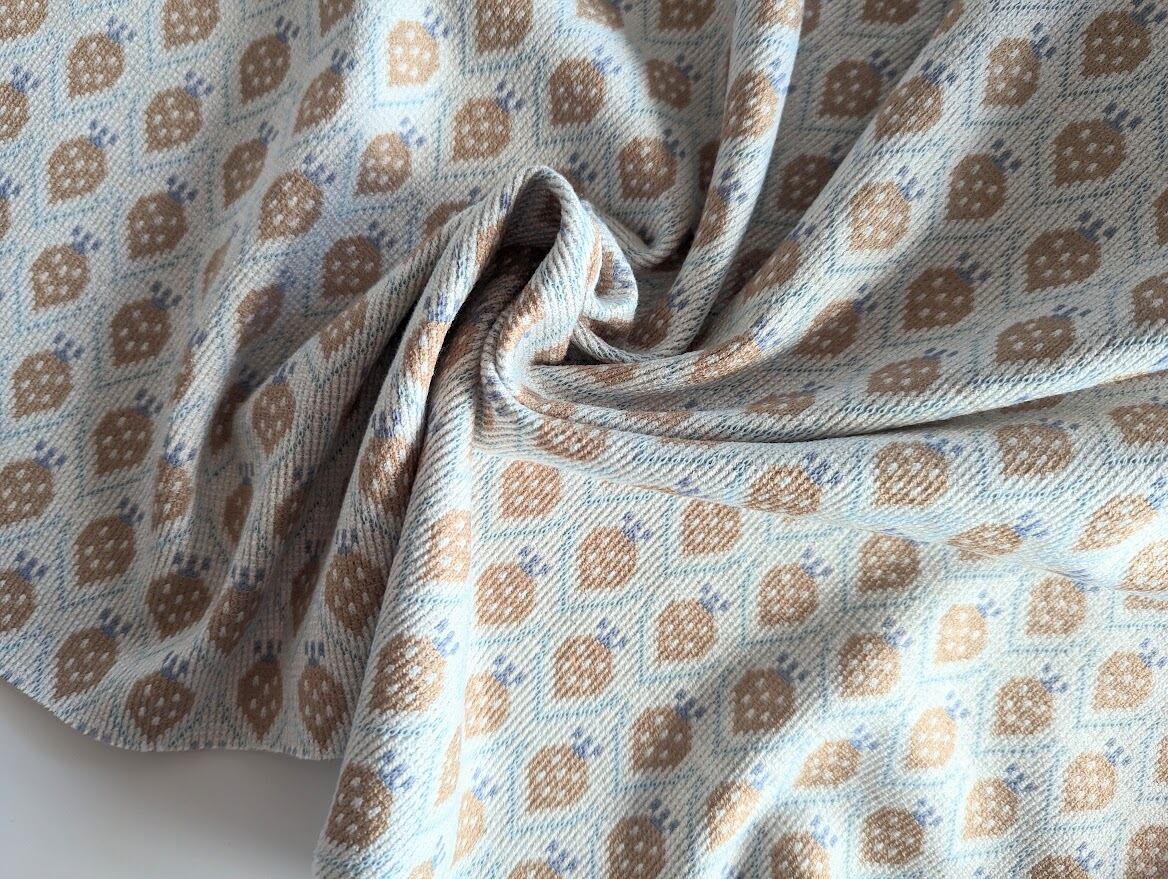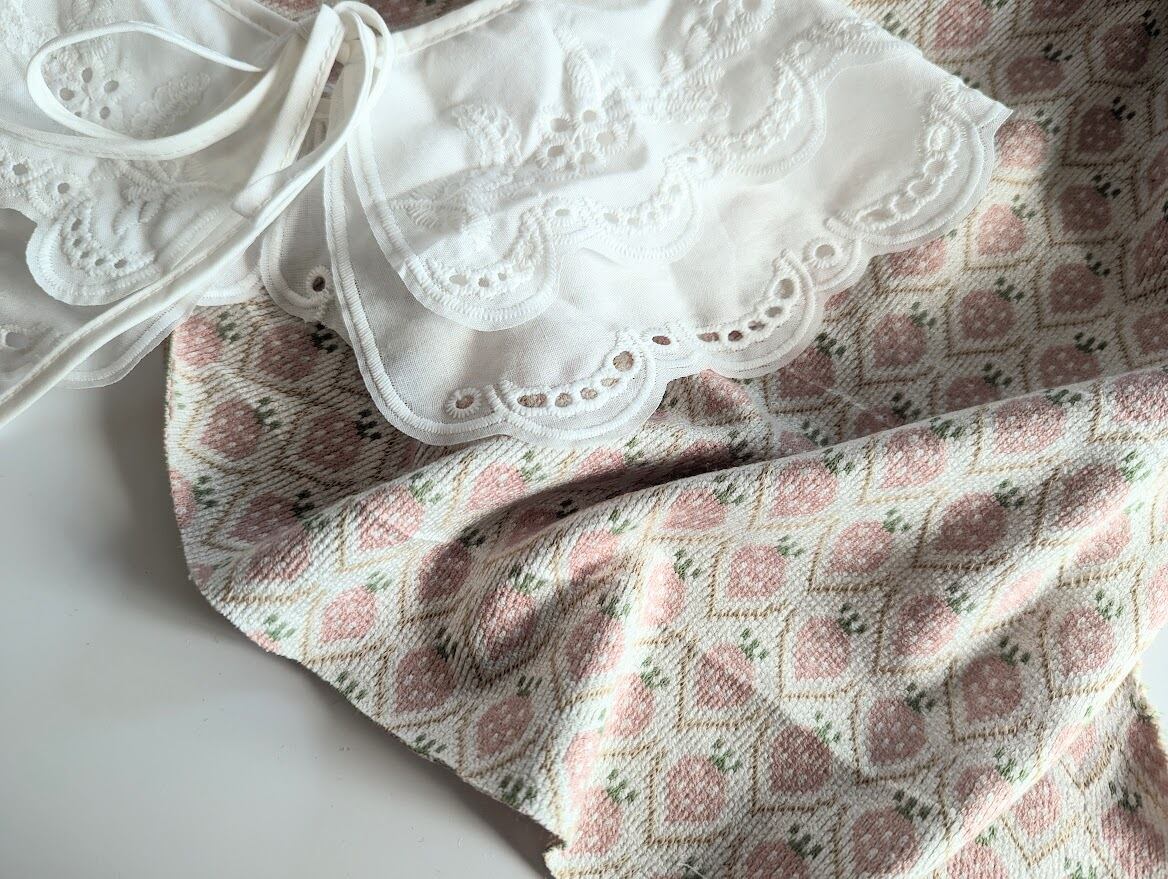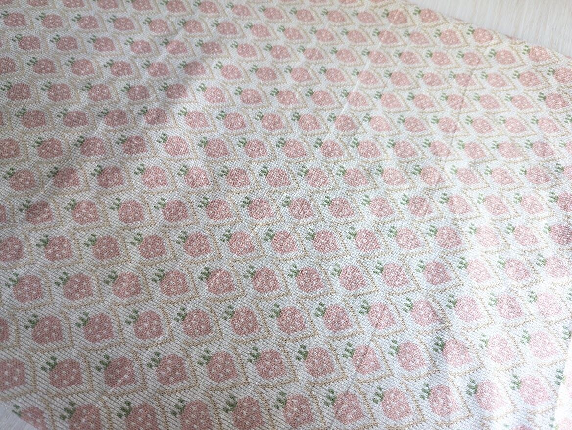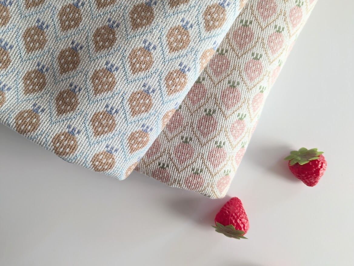 いちごが規則的に並ぶデザインで、子ども服や小物づくりにぴったりの控えめな甘さが魅力。