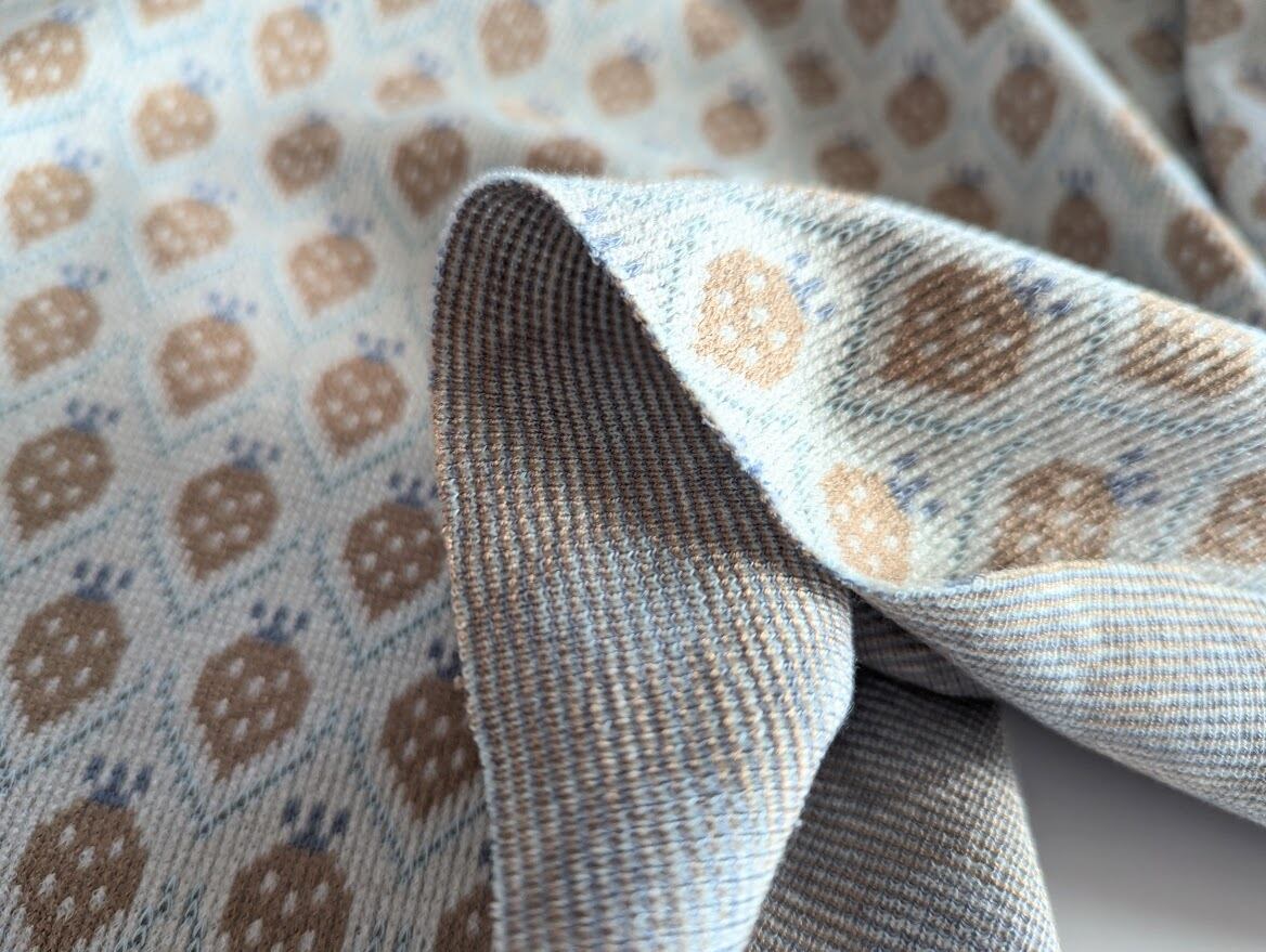 やさしいミルキートーンで編み上げた、ふんわり可愛いいちご柄のニット生地です。