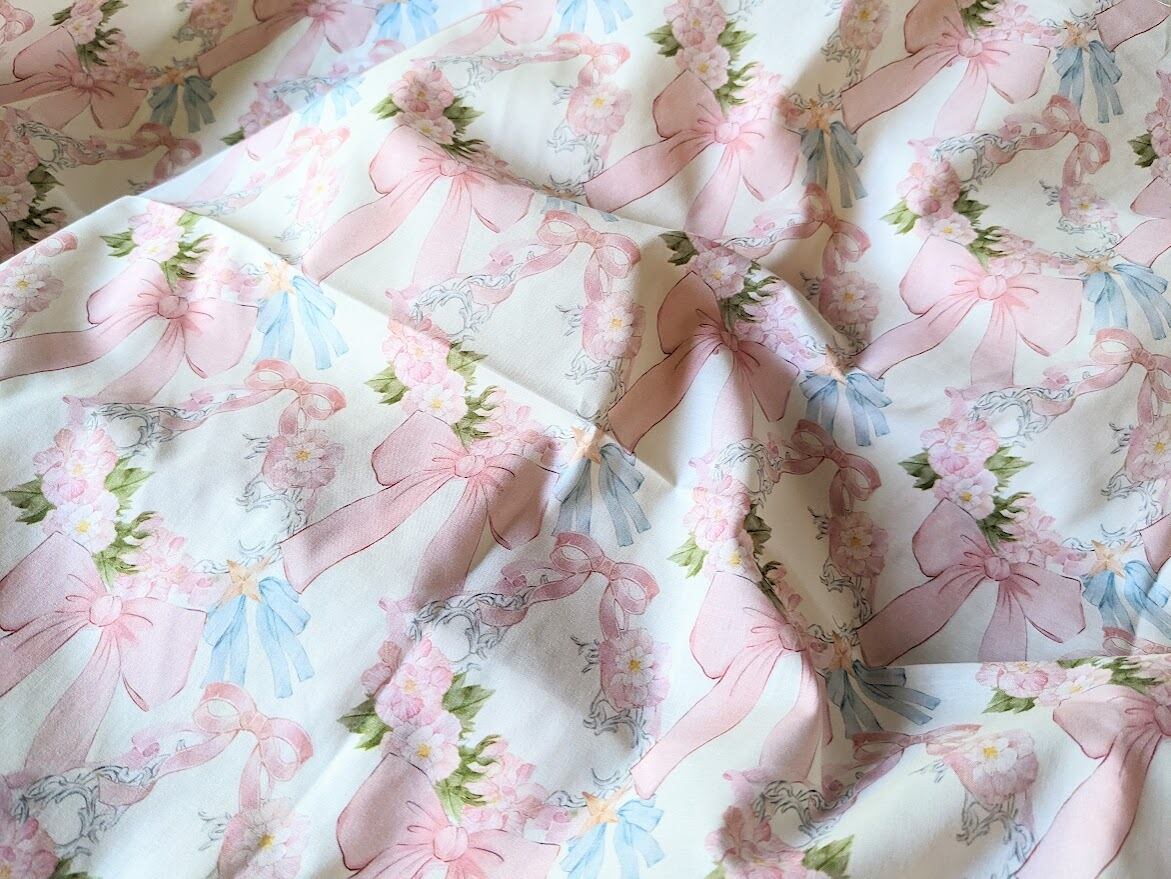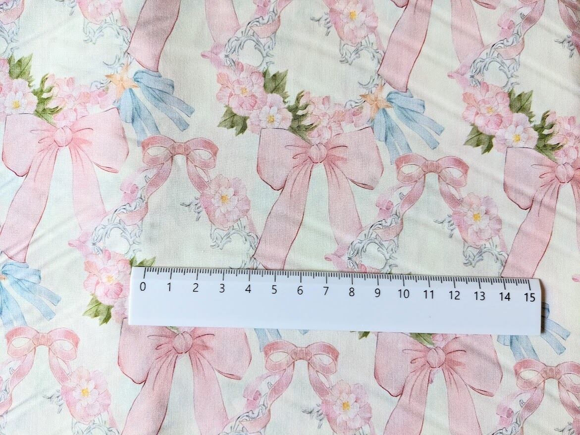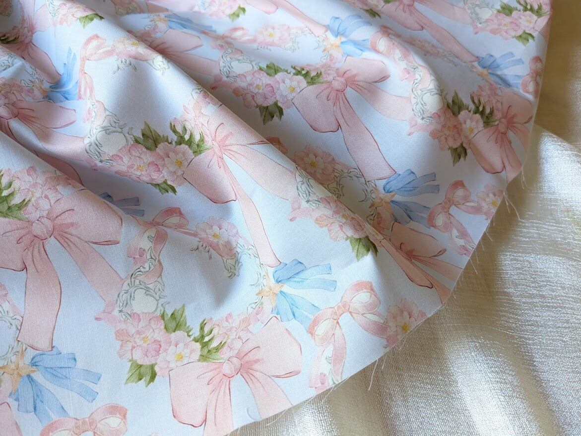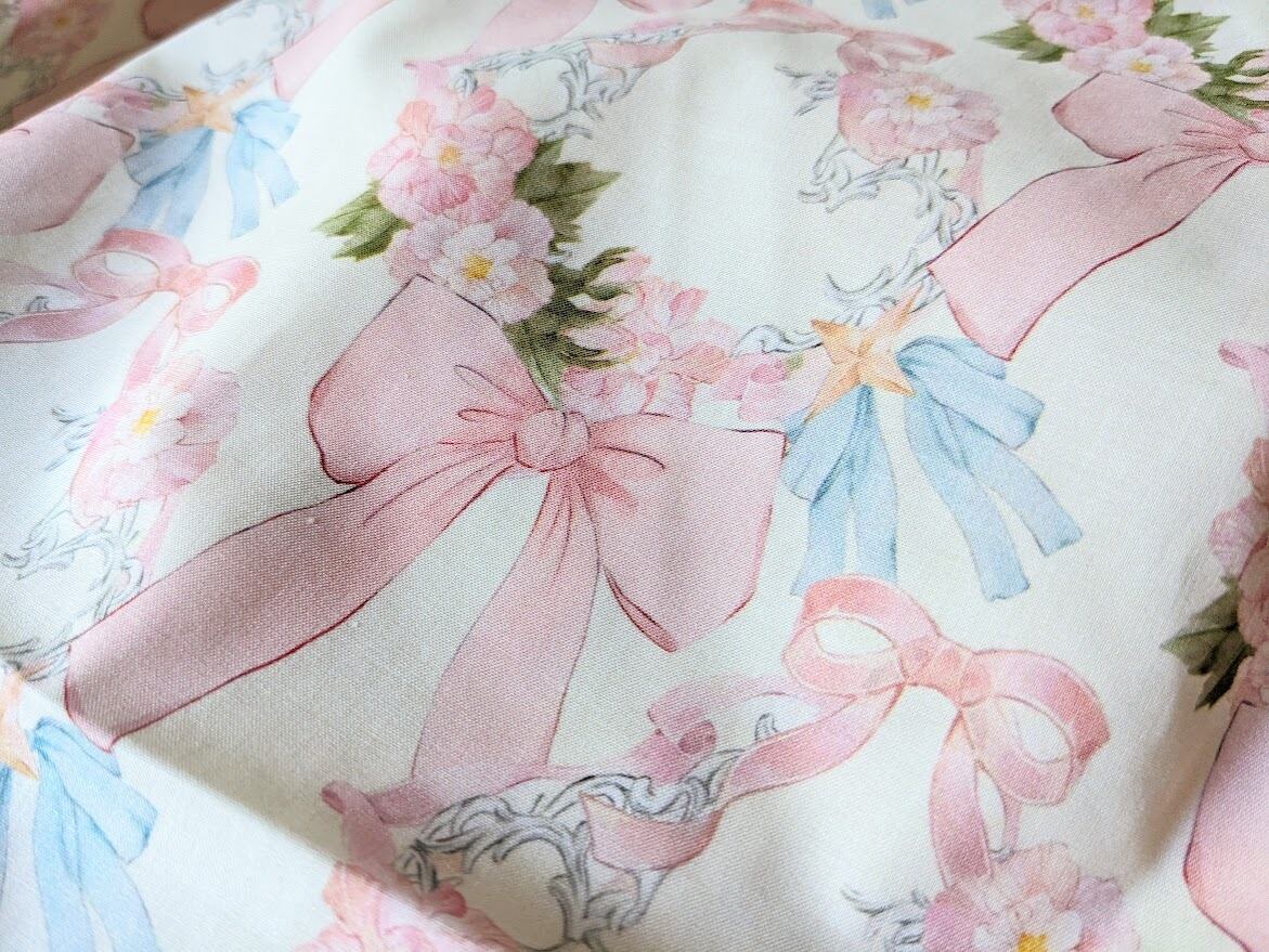 可憐なリボンとお花のイラストがきれいなコットン生地。