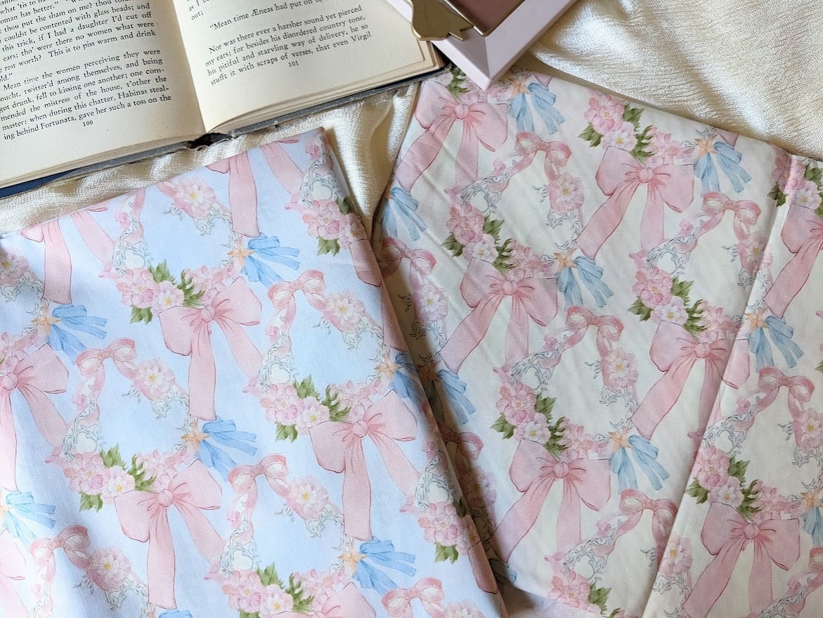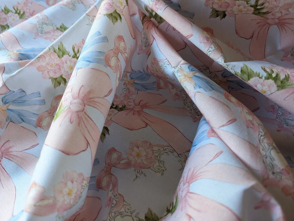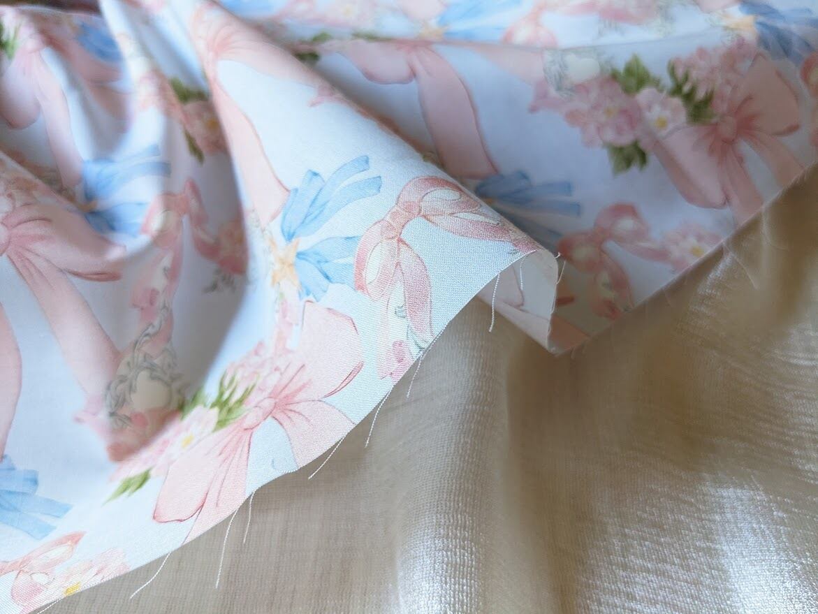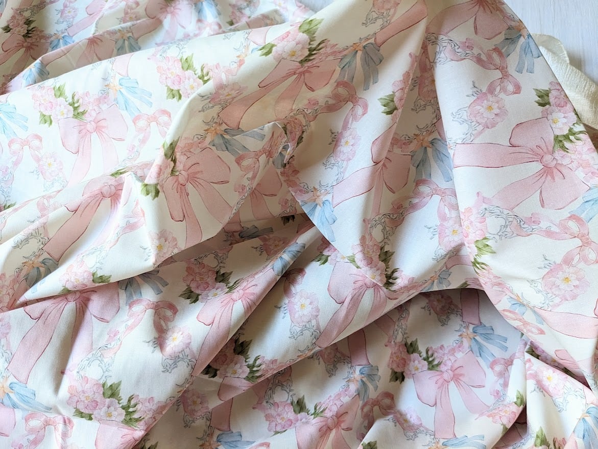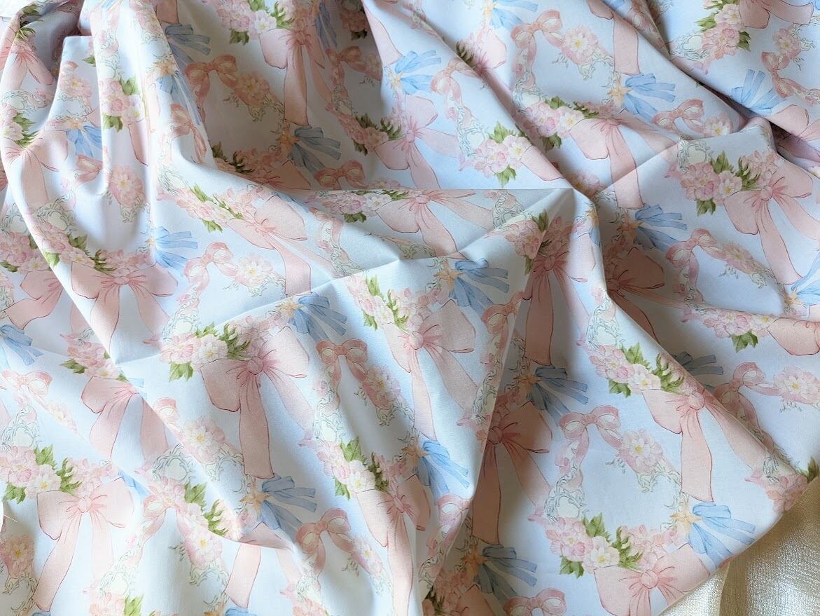 可憐なリボンとお花のイラストがきれいなコットン生地。